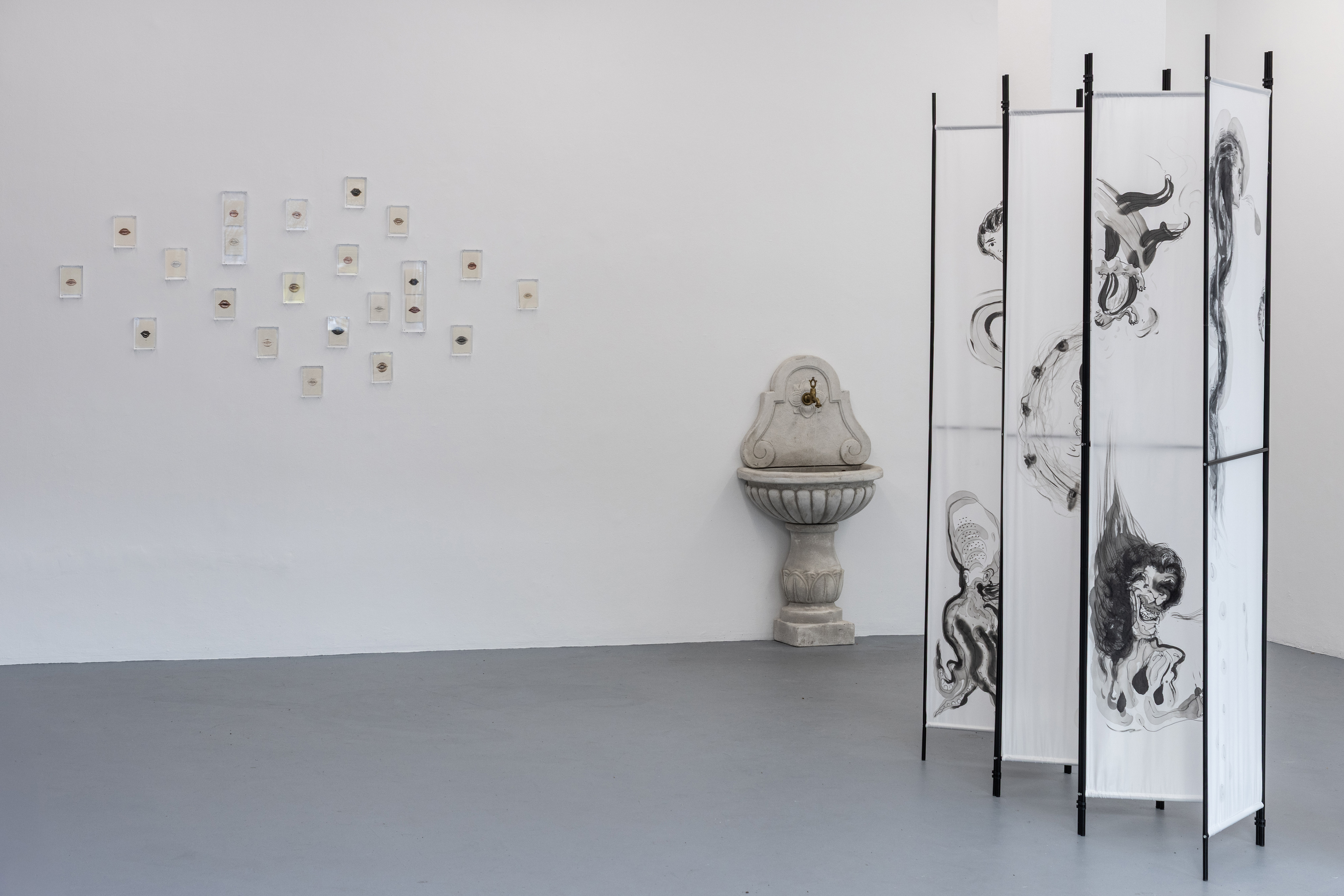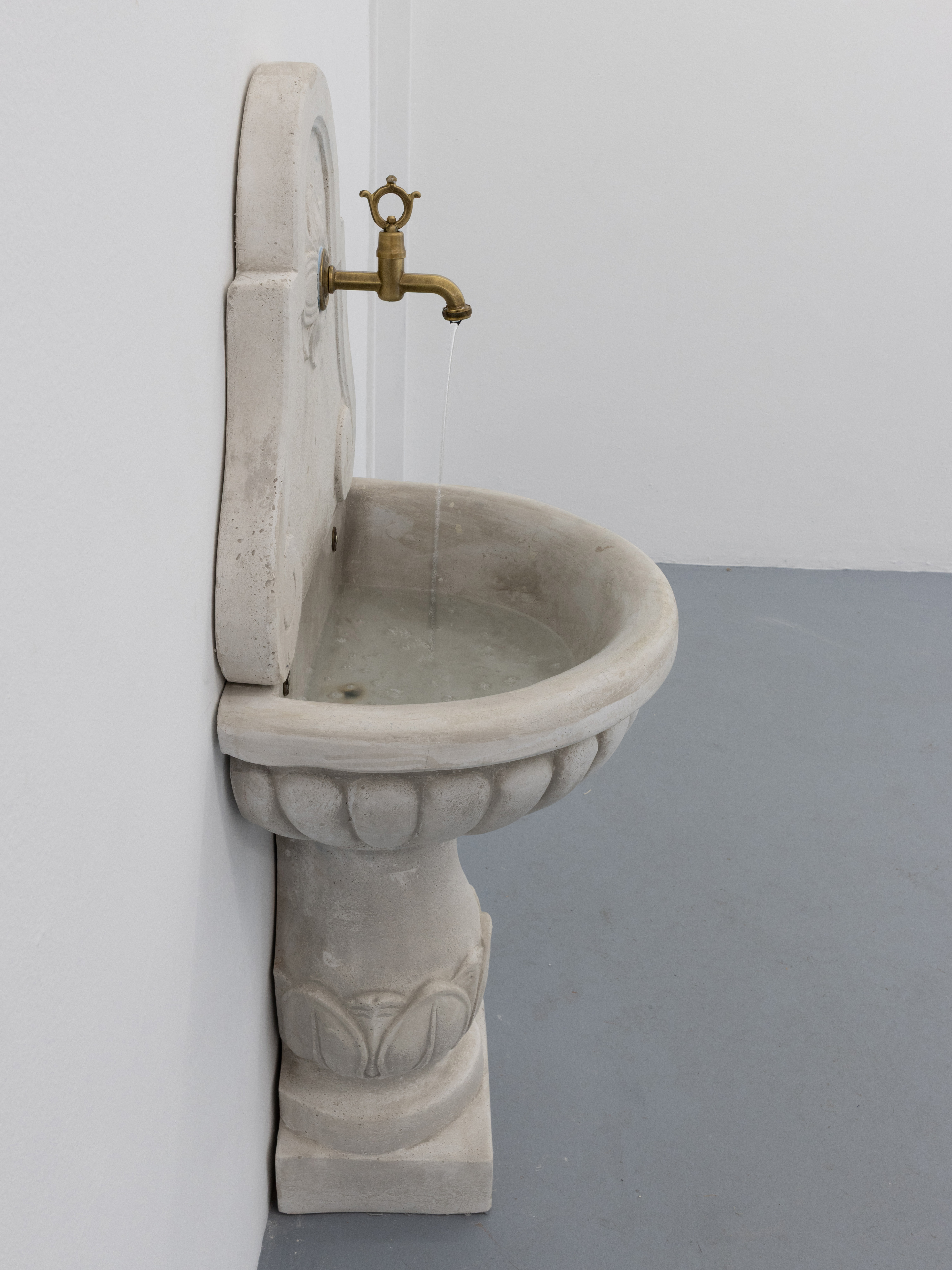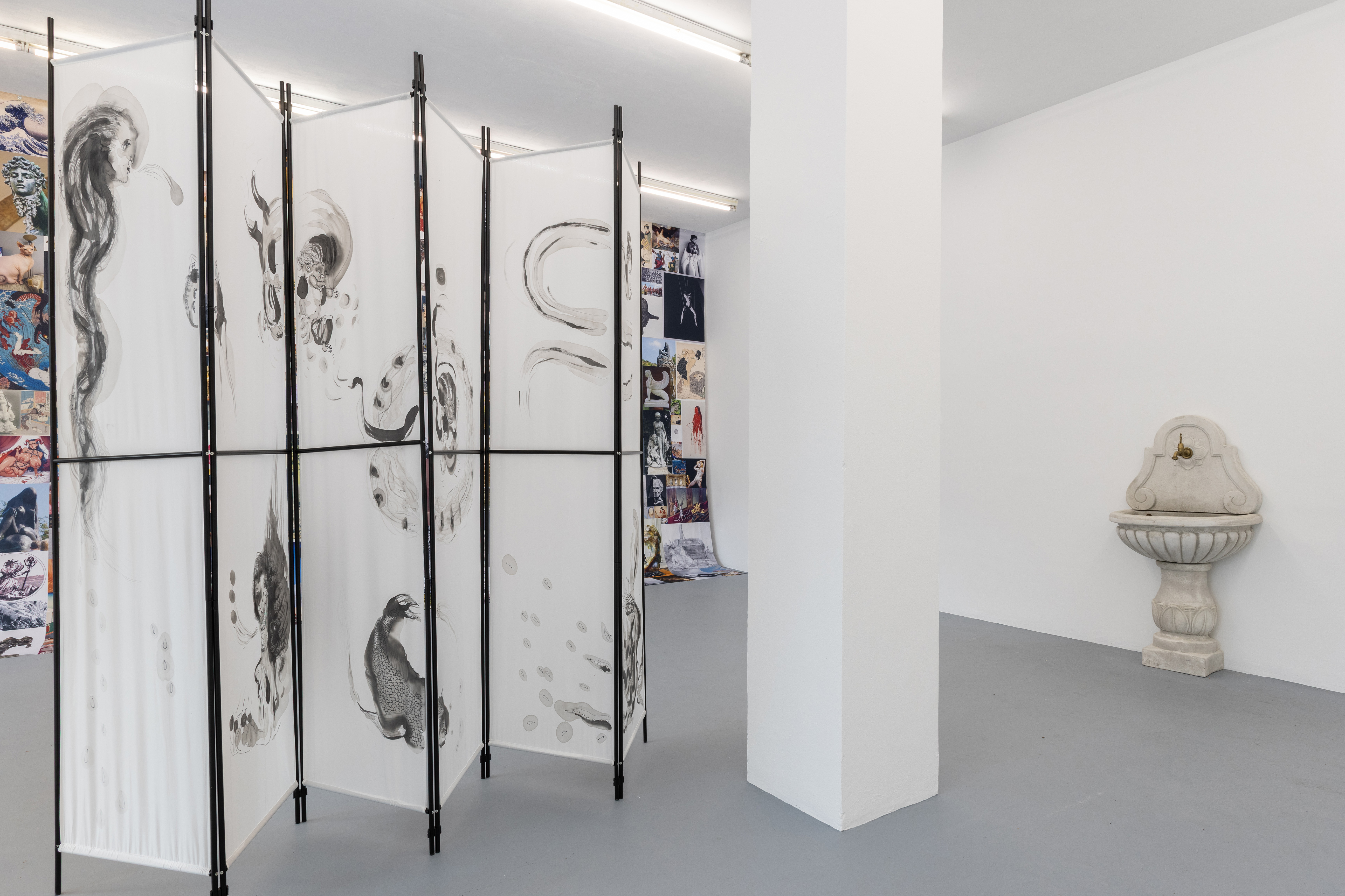 A further intervention within the exhibition and an artist talk with Fürnkäs are conceived as an integral, deliberately placed component of the broader multimedia project. The exhibition additionally includes — true to its title — a real, solid fountain as a readymade, in which water actually bubbles, as well as a folding screen (paravent) designed by the artist through drawing and painting. These two sculptural elements are conceived as integral and meaning-generating components of the immersive installation. In other words, as visitors we do not merely perceive the images, sculptures, forms, and colors before us — and our historically developed relationships to and with them — but, in a self-reflexive sense, also ourselves, and thus the conditions under which we see and think at this very moment.