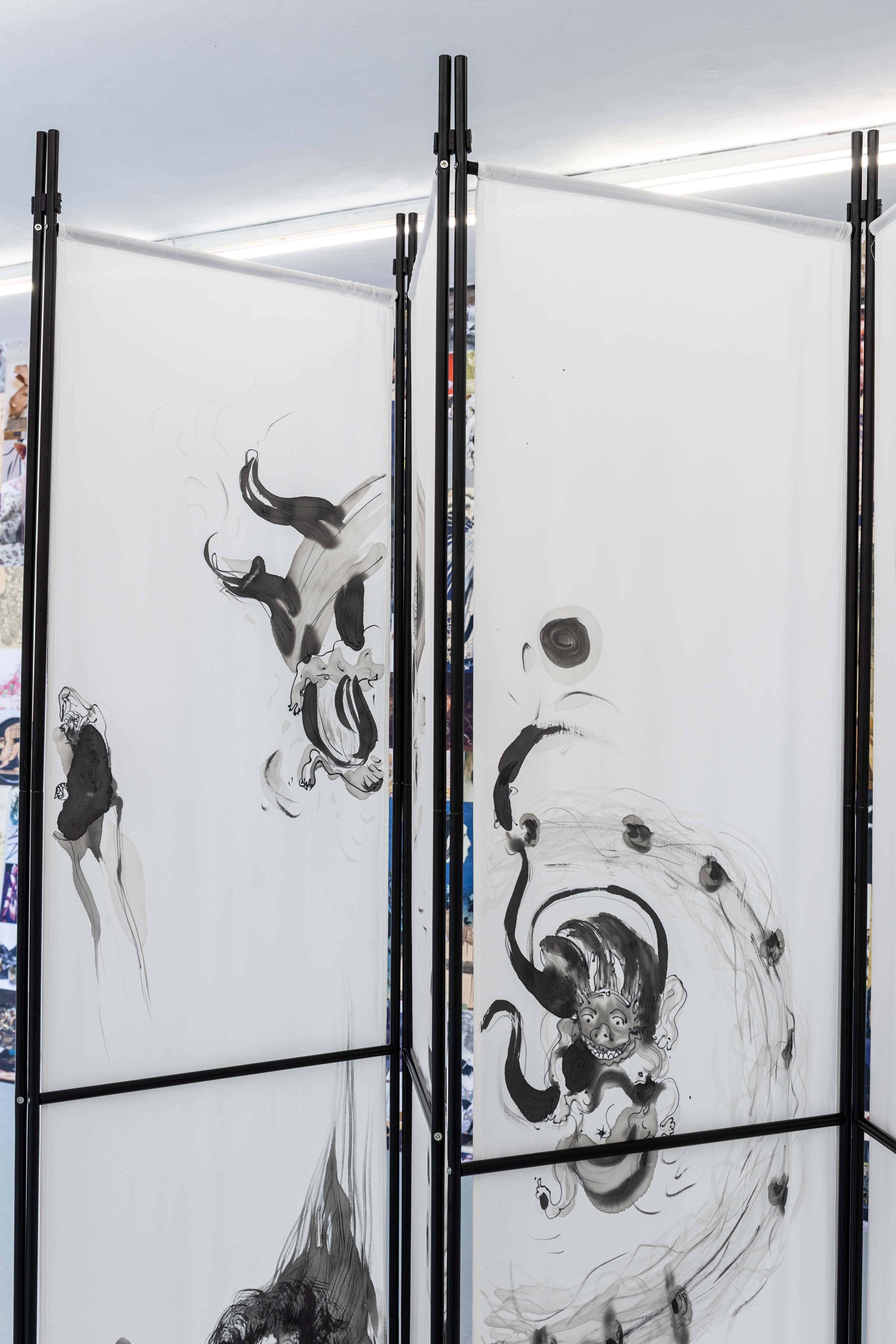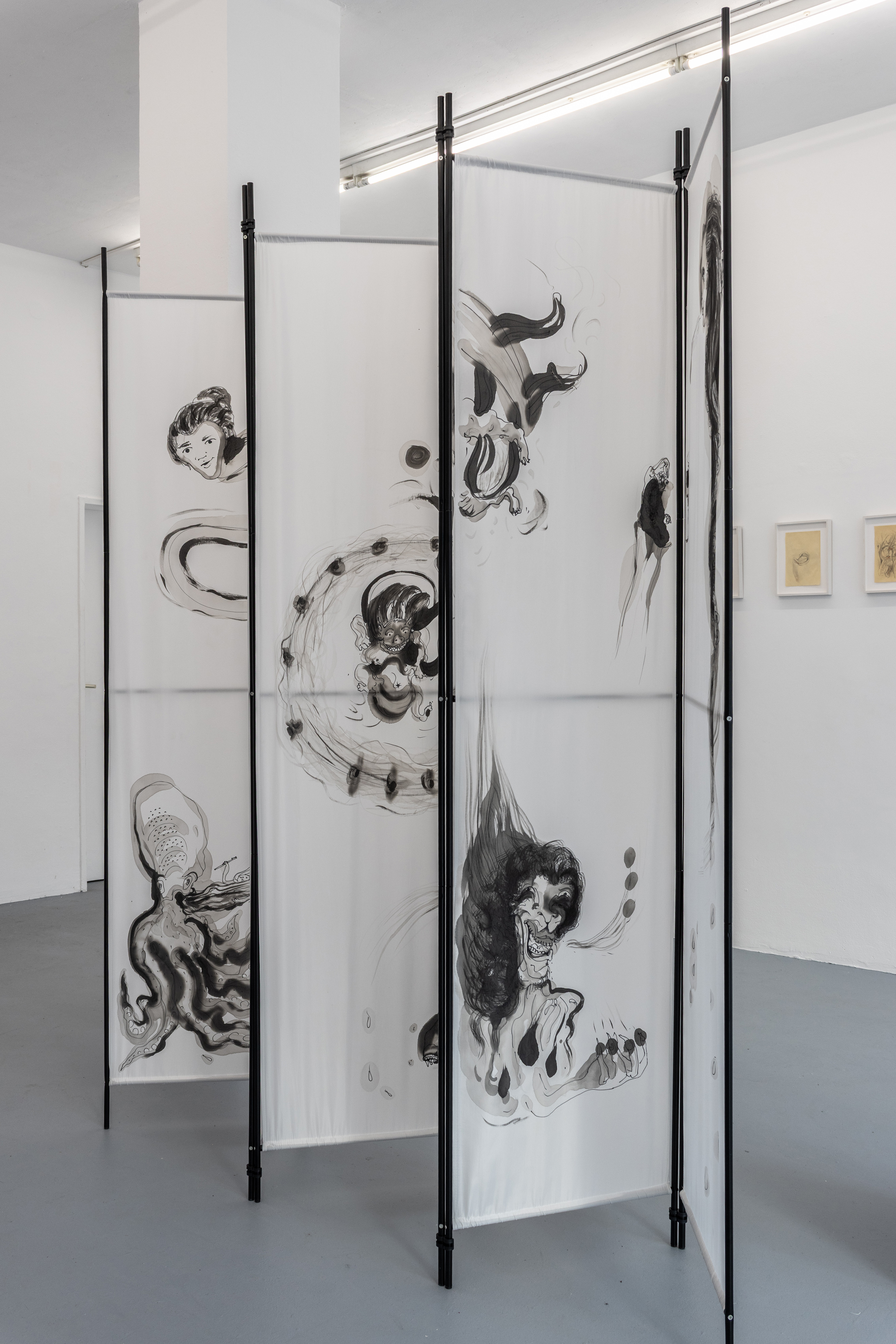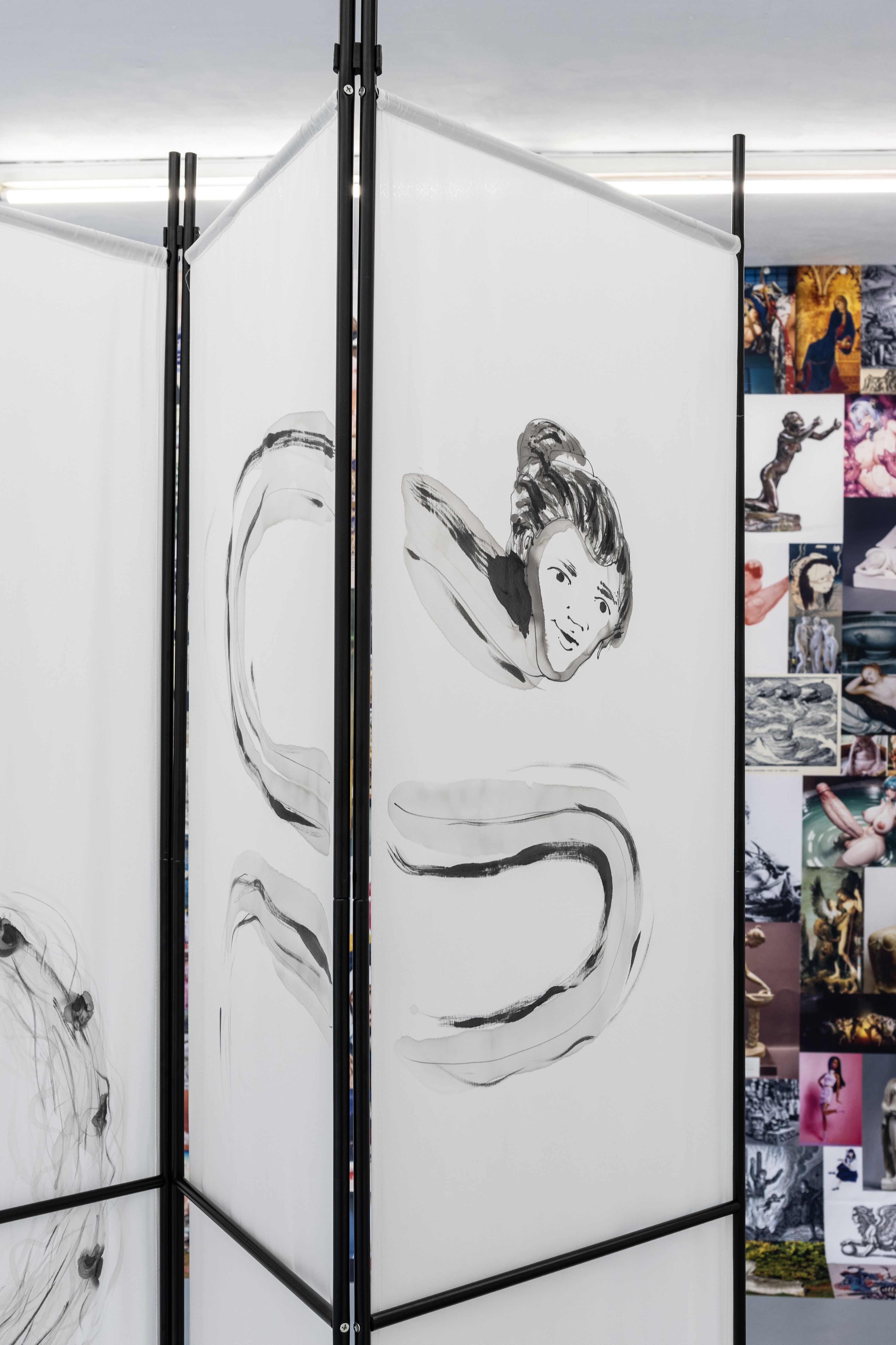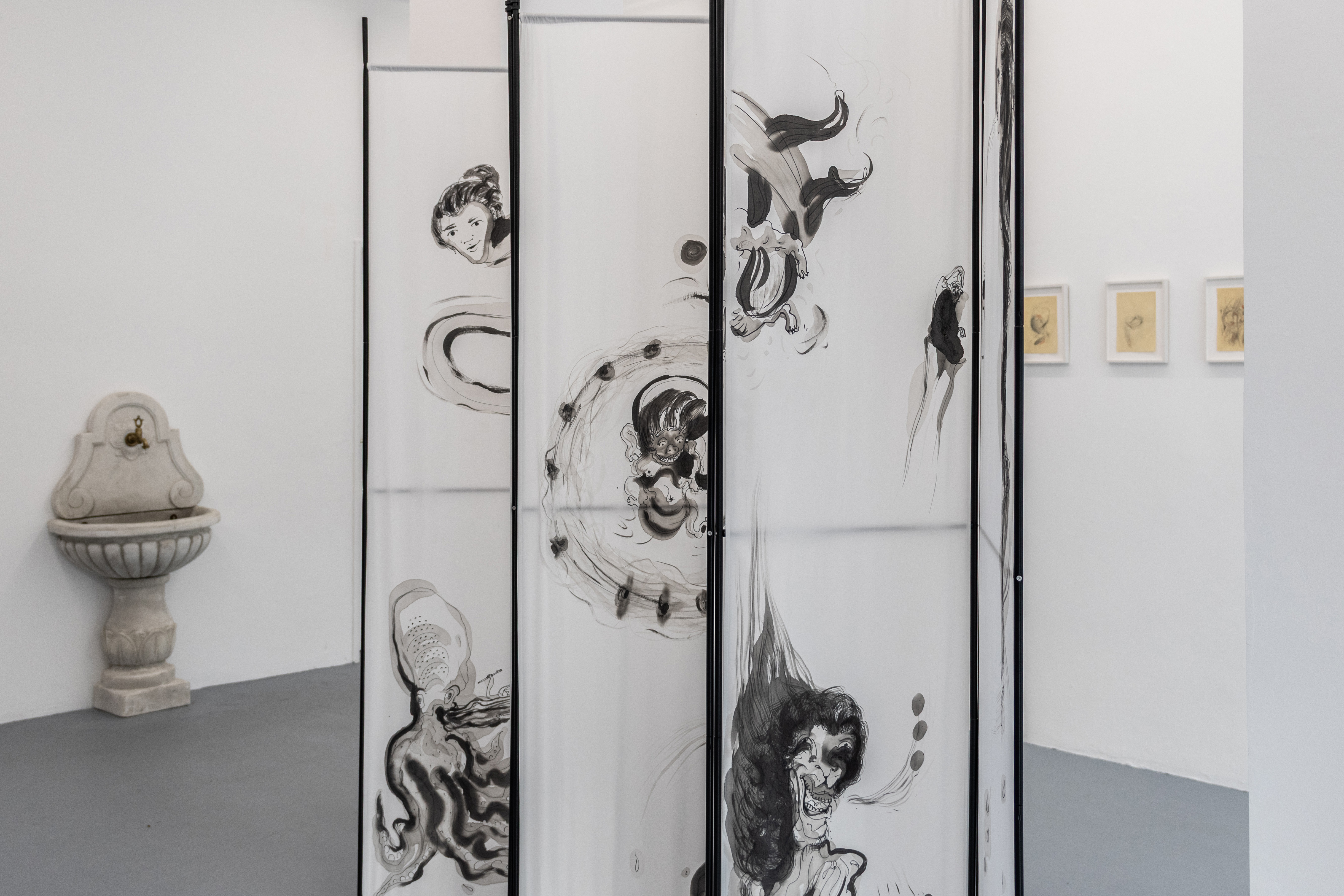 A further intervention within the exhibition and an artist talk with Fürnkäs are conceived as an integral, deliberately placed component of the broader multimedia project. The exhibition additionally includes — true to its title — a real, solid fountain as a readymade, in which water actually bubbles, as well as a folding screen (paravent) designed by the artist through drawing and painting. These two sculptural elements are conceived as integral and meaning-generating components of the immersive installation. In other words, as visitors we do not merely perceive the images, sculptures, forms, and colors before us — and our historically developed relationships to and with them — but, in a self-reflexive sense, also ourselves, and thus the conditions under which we see and think at this very moment.